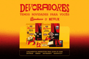 A campanha da collab entre duas das marcas mais amadas pelos brasileiros brinca com a ideia de “devorar” séries