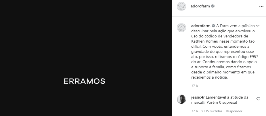 No mesmo dia (09), a Farm se desculpou por meio do Instagram, cancelando a ideia e que a mesma foi pensada por uma vendedora. “A Farm vem a público se desculpar pela ação que envolveu o uso do código de vendedora de Kathlen Romeu nesse momento tão difícil. Com vocês, entendemos a gravidade do que representou esse ato, por isso, retiramos o código E957 do ar. Continuaremos dando o apoio e suporte à família, como fizemos desde o primeiro momento em que recebemos a notícia”, escreveram em novo post e também na edição do antigo.