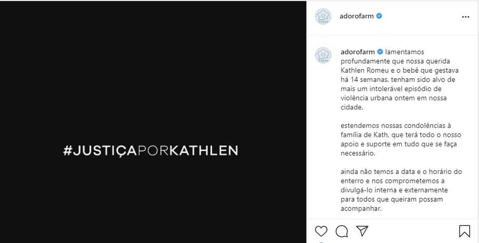 “Também estamos disponibilizando suporte psicológico e emocional a todos os que necessitem através do nosso gente & gestão. A partir de hoje, toda a venda feita no código de Kathlen – E957 – terá sua comissão revertida em apoio para sua família, reforçando que nós também vamos apoiá-la de forma independente e paralela. Sabemos que nada que fizermos poderá trazer Kath de volta mas nos comprometemos a acelerar ainda mais nossos processos de inclusão e equidade racial para transformar as cruéis estatísticas que levam vidas jovens negras como a de Kath a cada 23 minutos no nosso país. As vidas de Kath e seu bebê importam. Vidas negras importam. Aqui, hoje, sempre. Transformar é urgente”, dizia o post publicado pela Farm.