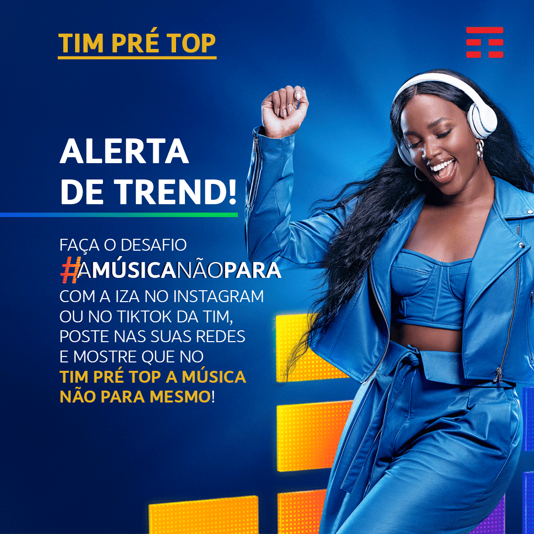 Os clientes TIM agora podem subir num palco virtual em suas próprias casas ao lado do seu ídolo, num dueto com direito até a coreografia. A operadora lançou nesta terça-feira (22) um desafio onde o usuário dividirá o microfone e o smartphone com a embaixadora da marca e da nova campanha do segmento pré-pago, a cantora IZA. O objetivo é cantar com a artista ao som do hit “Don’t stop the music”, trilha sonora do novo filme publicitário da TIM. A ação, criada pela BETC HAVAS, acontece no TikTok e também pode ser compartilhada no Reels, do Instagram.